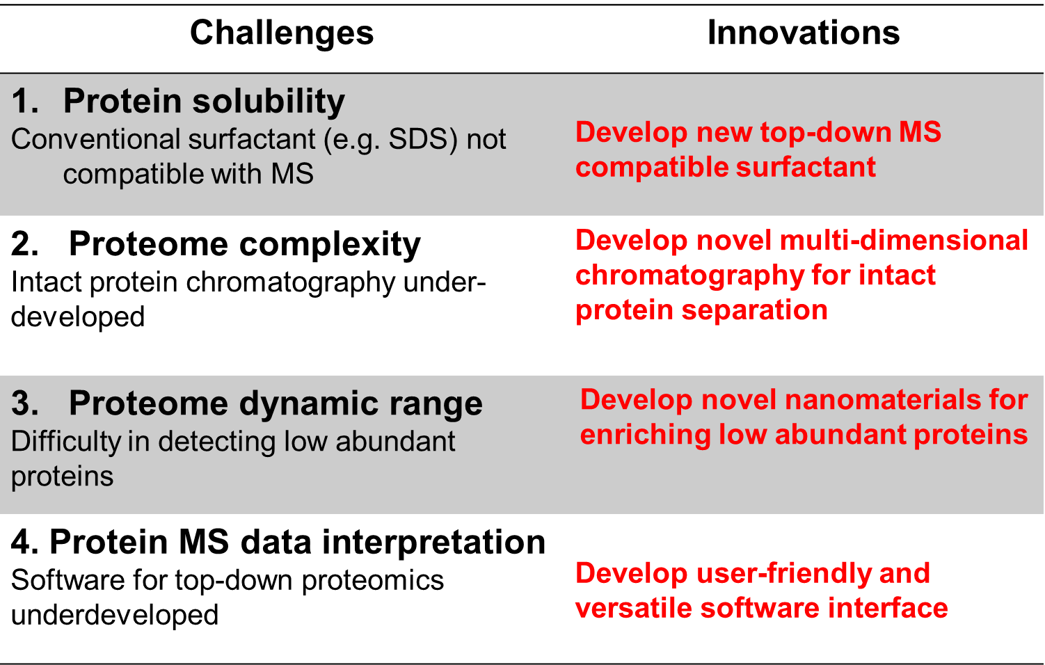 Nevertheless, the top-down MS approach still faces significant challenges in terms of protein solubility, separation, and the detection of low abundance and large proteins, as well as under-developed data analysis tools.6,9 Consequently, new technological developments are urgently needed to advance the field of top-down proteomics. We have been establishing an integrated top-down disease proteomics platform to globally examine intact proteins extracted from tissues for the identification and quantification of proteins and possible PTMs present in vivo. Specifically, we are developing novel approaches to address the current challenges in top-down MS-based proteomics (Table 1 ). |